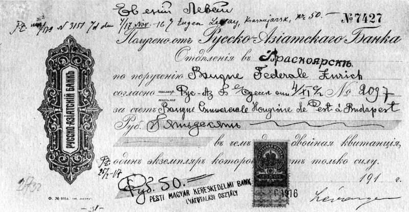 Ez az 50 rubel értékű hadifogoly-utalási nyugta egy zürichi bank közreműködésével ért cél a szibériai Krasznojarszkban